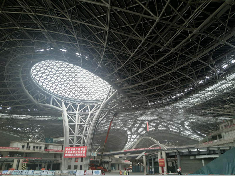 首先,我司參觀了航站樓屋面網(wǎng)架體系。該網(wǎng)架結(jié)構(gòu)由8個(gè)巨型C形柱及周邊幕墻搖擺柱支撐,安裝時(shí)采用分塊頂升的方式,各區(qū)塊間通過(guò)條形采光天窗連成整體。航站樓屋頂面積達(dá)18萬(wàn)平方米,是世界上單體面積最大的屋面之一。其次參觀了航站樓核心區(qū)隔震體系。由于核心區(qū)結(jié)構(gòu)超長(zhǎng)、超大,溫度作用顯著,同時(shí)航站樓核心區(qū)下部設(shè)有高鐵和地鐵車(chē)站,因此采用隔震技術(shù)。在核心區(qū)地下 1 層頂設(shè)置隔震層,使得整個(gè)核心區(qū)可以不設(shè)置溫度變形縫,能夠減少地鐵對(duì)上部結(jié)構(gòu)的振動(dòng),使地震烈度降低一度。最后參觀了基于BIM的空間鋼結(jié)構(gòu)預(yù)拼裝理論技術(shù)在工程中的應(yīng)用,通過(guò)三維掃描技術(shù)將制作好的鋼構(gòu)件三維坐標(biāo)導(dǎo)入計(jì)算機(jī)內(nèi)進(jìn)行預(yù)拼裝,省去了實(shí)體預(yù)拼裝流程,節(jié)約空間及時(shí)間。