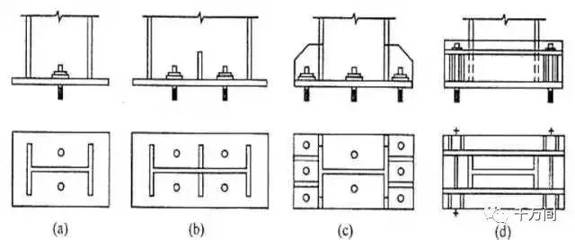 門式剛架輕型房屋鋼結構的柱腳宜采用平板式鉸接柱腳(圖a、b)。當有必要時,也可采用剛性柱腳(圖c、d)。