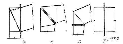 門式剛架橫梁與柱的連接,可采用端板豎放(圖a) 、端板斜放(圖b) 和端板平放(圖c) 。橫梁拼接時宜使端板與構件外緣垂直(圖d)。