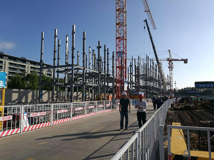 我司楊總分別帶領(lǐng)考察團(tuán)隊(duì)參觀了19#-22#樓、1#-5#樓的主體結(jié)構(gòu),以及16#、18#樓的地下室結(jié)構(gòu)?疾烊藛T詢問(wèn)了關(guān)于地下室柱腳與基礎(chǔ)筏板鋼筋連接處理節(jié)點(diǎn)、鋼結(jié)構(gòu)安裝進(jìn)度及裝配率等相關(guān)問(wèn)題,楊總分別針對(duì)這些問(wèn)題做了詳細(xì)講解,還特地介紹了隱式鋼框架的特點(diǎn)。接著又帶考察人員參觀了樣板區(qū)區(qū)域,考察人員對(duì)此給予了高度評(píng)價(jià)。