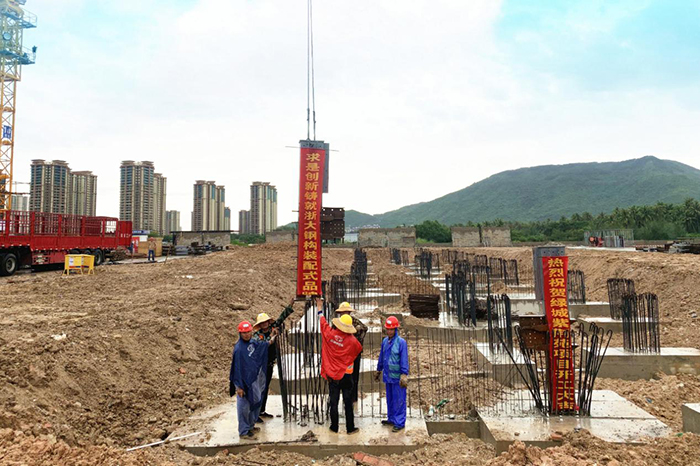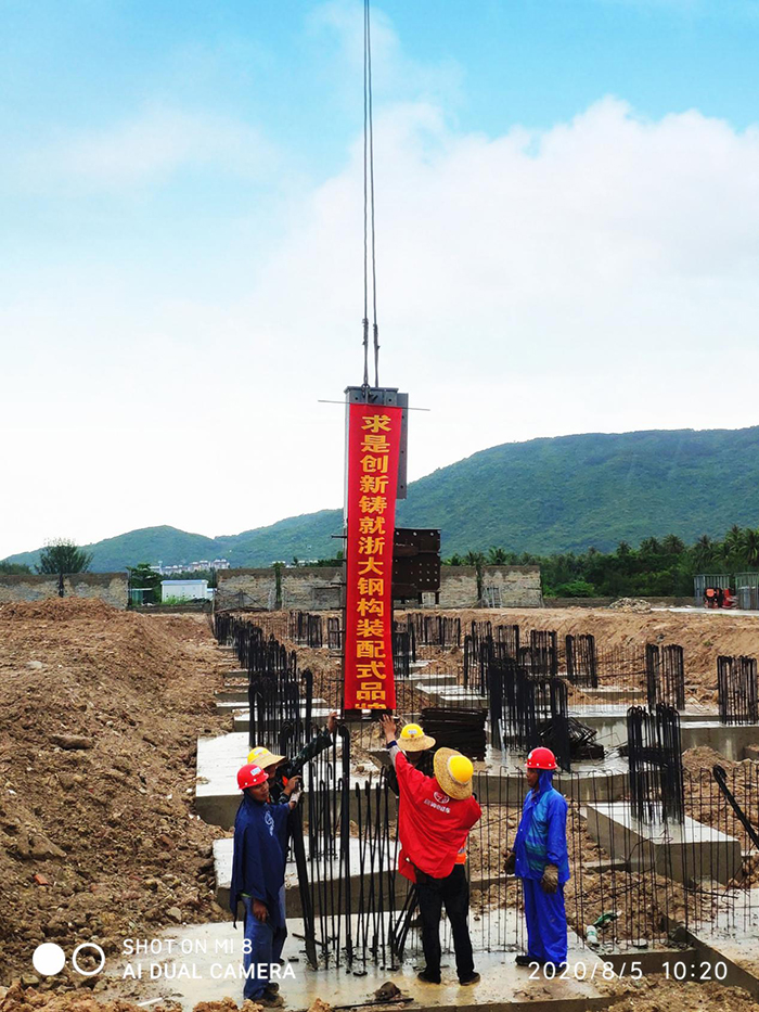 8月5日上午,由浙大鋼構(gòu)承建的陵水綠城藍(lán)灣小鎮(zhèn)紫荊苑鋼結(jié)構(gòu)項(xiàng)目首根鋼柱順利完成吊裝,紫荊苑項(xiàng)目正式開工。