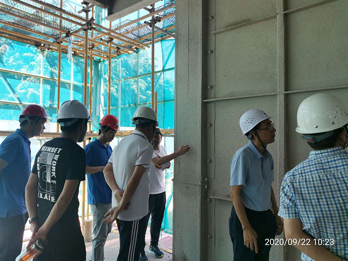 首先由陳經(jīng)理在會議室進行了項目情況的簡單介紹,從項目整體建設到現(xiàn)場施工情況,以及隱式鋼框架結(jié)構(gòu)體系在本項目中凸顯的優(yōu)勢。然后,項目部人員陪同考察團現(xiàn)場實地參觀,直觀調(diào)研整體在建工程,包括鋼結(jié)構(gòu)裝配式住宅的施工工期、施工順序、各工序之間的關系協(xié)調(diào)等主要環(huán)節(jié),多方面了解本工程的施工經(jīng)驗。接著參觀了室外樣板展示區(qū)、樣板間,對鋼結(jié)構(gòu)的防腐防火處理及材料選用進行了細致討論,并就柱內(nèi)混凝土澆筑問題、隔音保溫隔熱處理等施工工藝進行交流探討。