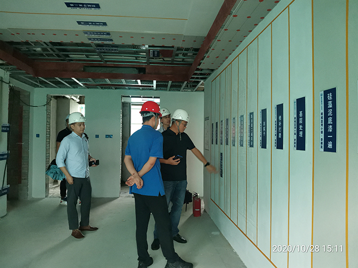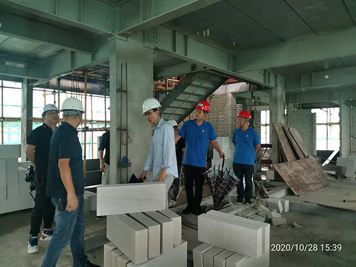 隨后,考察團考察了陵水綠城香樟苑、紫荊苑項目施工現(xiàn)場?疾靾F主要關注到:鋼柱防火涂料施工與土建磚墻連接、外墻防水施工節(jié)點、鋼梁吊頂和不吊頂封堵施工做法、外墻防水、室內(nèi)分戶墻和隔墻用材料等施工細節(jié),及隱式框架開間大、中間沒有剪力墻,后期易改造的明顯優(yōu)勢。