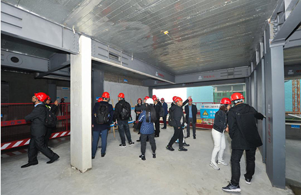 課題組還組織與會(huì)專家到由杭州鐵木辛柯建筑結(jié)構(gòu)設(shè)計(jì)事務(wù)所鋼結(jié)構(gòu)設(shè)計(jì),中建科工集團(tuán)有限公司專業(yè)承包的濱江·綠城江河鳴翠項(xiàng)目進(jìn)行現(xiàn)場(chǎng)觀摩。該項(xiàng)目位于江干區(qū)四季青街道運(yùn)河?xùn)|路與錢江路交叉口,2#3#樓為裝配式鋼結(jié)構(gòu)住宅,結(jié)構(gòu)體系采用隱式框架-鋼板剪力墻體系,地上建筑面積約15948㎡,地上23層,建筑高度73m。