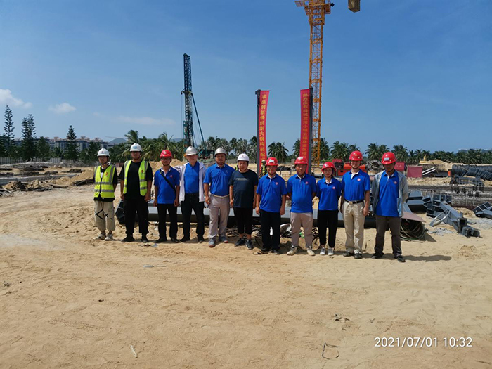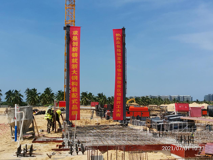 今年是中國共產黨成立100周年,百年恰是風華正茂。2021年7月1日上午10點08分,在甲方單位、監(jiān)理單位等領導的共同見證下,由浙大鋼構承建的海南綠城藍灣小鎮(zhèn)繼2019年開工的香樟苑以來,第五個鋼結構裝配式高端住宅項目——云棲居南區(qū)鋼結構工程項目首根鋼柱吊裝順利完成,項目正式進入鋼結構主體施工階段。