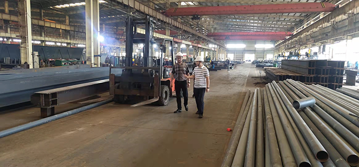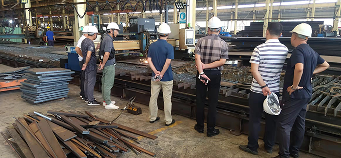 隨后來到我司鋼結(jié)構(gòu)加工生產(chǎn)基地考察,劉總工將各工廠的規(guī)模、生產(chǎn)能力、鋼結(jié)構(gòu)的全生產(chǎn)周期等進(jìn)行一一講解。雙方就施工圖設(shè)計、深化設(shè)計、材料采購、加工制造、構(gòu)件運輸、現(xiàn)場安裝、工期分析及重難點控制措施等問題深入交流。
