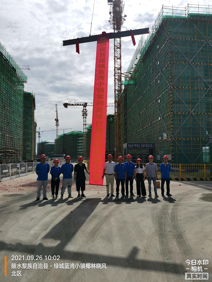 由海南浙大鋼構有限公司承建的繼香樟苑后又一個組團-陵水綠城藍灣小鎮(zhèn)紫荊苑裝配式鋼結構住宅項目于2021年9月26日上午10:00,在綠城陳海松總、黃建明總 ,江南監(jiān)理袁乃富總監(jiān)及我司方建平總、肖琦琛總、駱明松項目經(jīng)理等共同見證下順利舉行封頂儀式。
