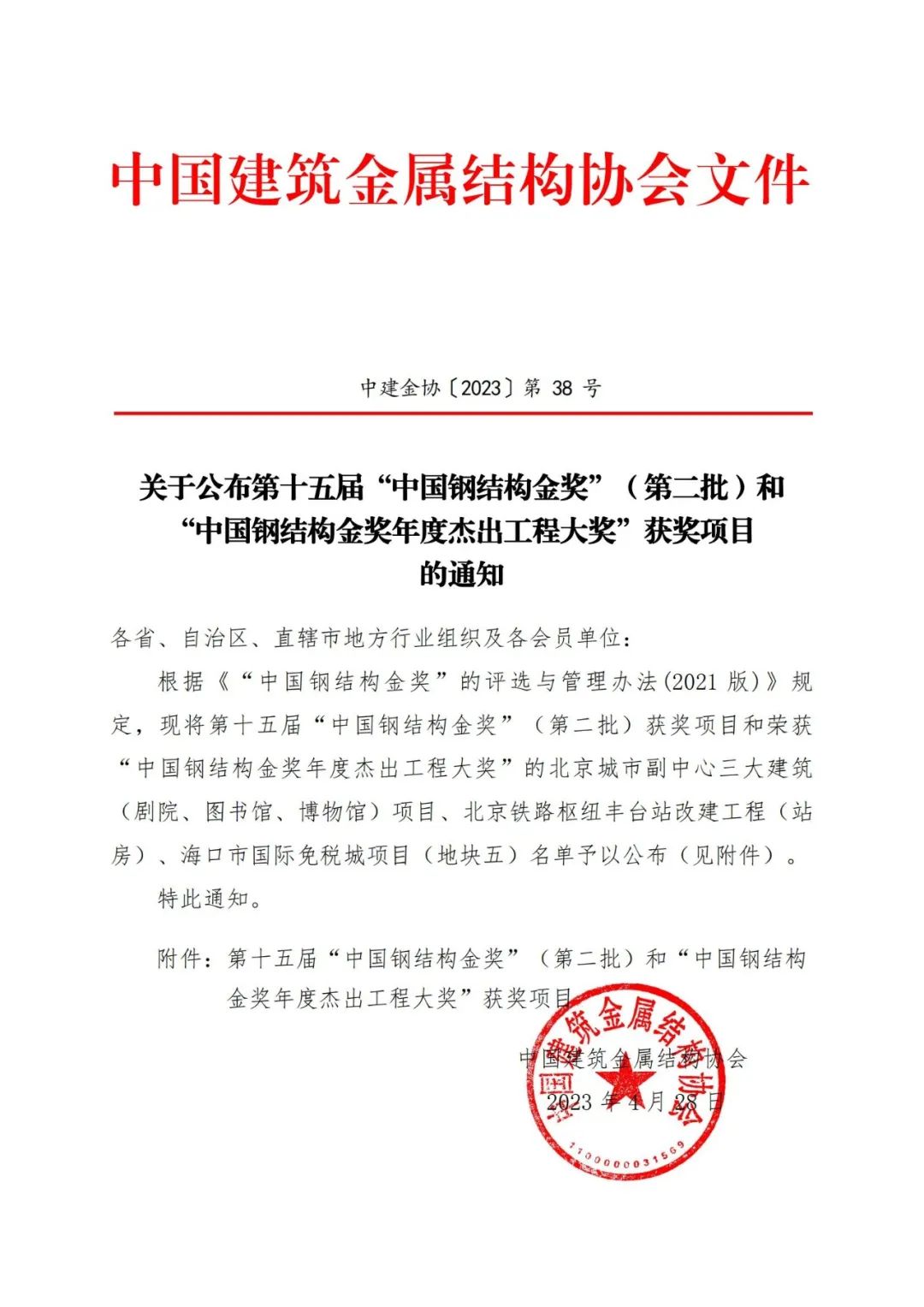 【獲獎(jiǎng)公告】關(guān)于公布第十五屆“中國鋼結(jié)構(gòu)金獎(jiǎng)”(第二批)和“中國鋼結(jié)構(gòu)金獎(jiǎng)年度杰出工程大獎(jiǎng)”獲獎(jiǎng)項(xiàng)目的通知