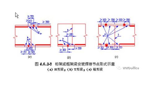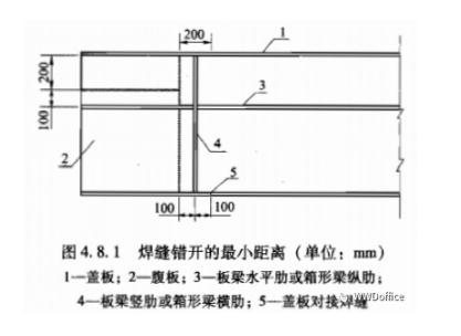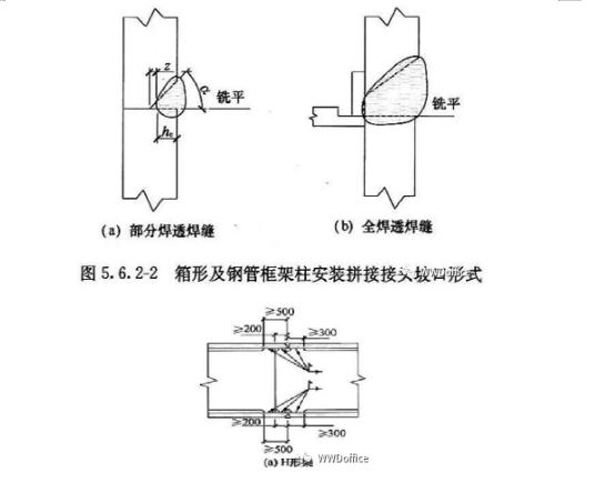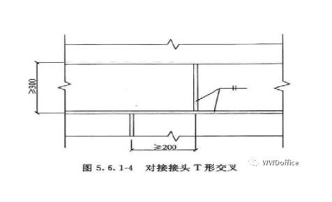 5.6.1 4 要求焊縫與母材等強(qiáng)和承受動(dòng)荷載的對(duì)接接頭,其縱橫兩方向的對(duì)接縫,宜采用T形交叉,交叉點(diǎn)的距離不宜小于200mm,且拼接料的長(zhǎng)度和寬度不宜小于300mm,如有特殊要求,施工圖應(yīng)注明焊縫的位置。