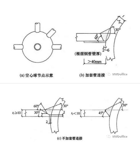 5 管材與空心球工地安裝焊接節(jié)點(diǎn)應(yīng)采取下列形式: