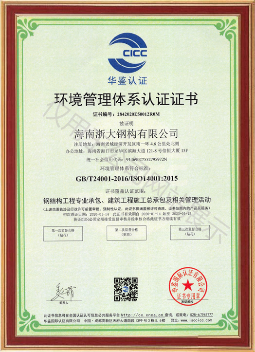 環(huán)境管理體系認證證書
